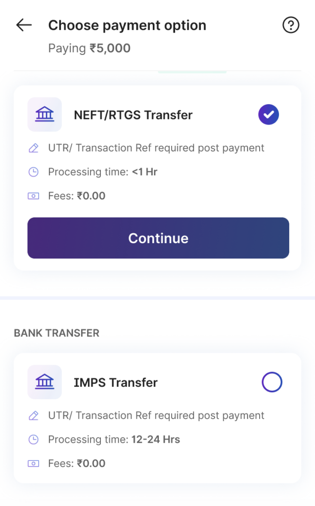Tap “NEFT/RTGS Transfer” and then select Continue.