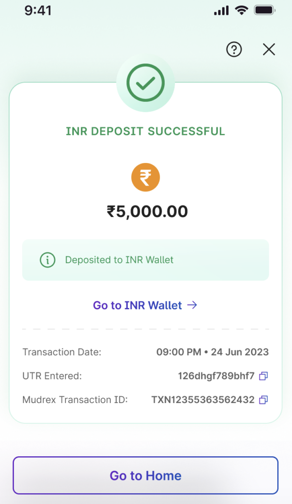 Once the payment is successfully processed, you will see the INR Deposit Successful screen.