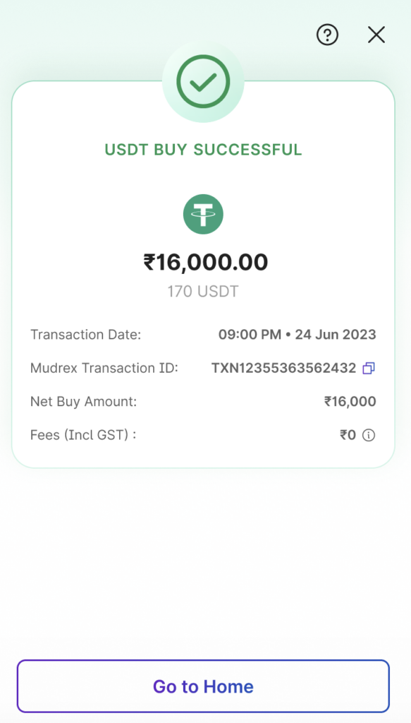 Once the transaction is completed, you will see the USDT Buy Successful screen.