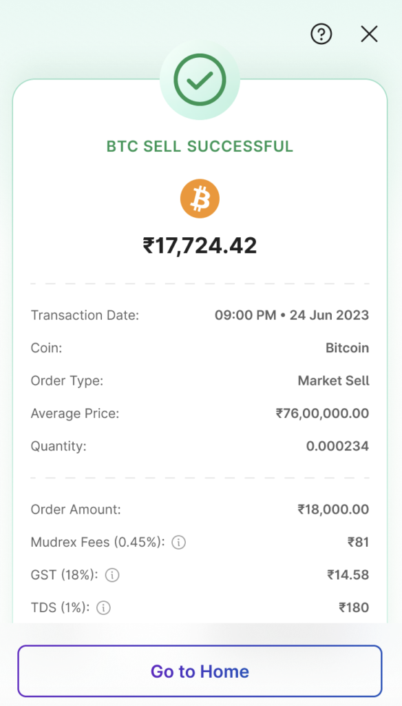 Once the transaction is successful, you will see the BTC Sell Successful screen.