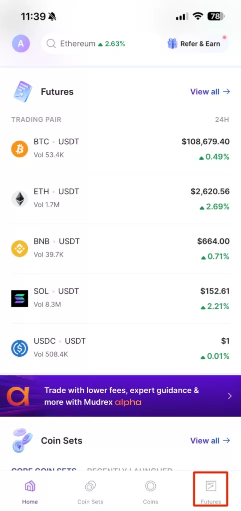 Step 1: Open the Mudrex app and tap the Futures icon