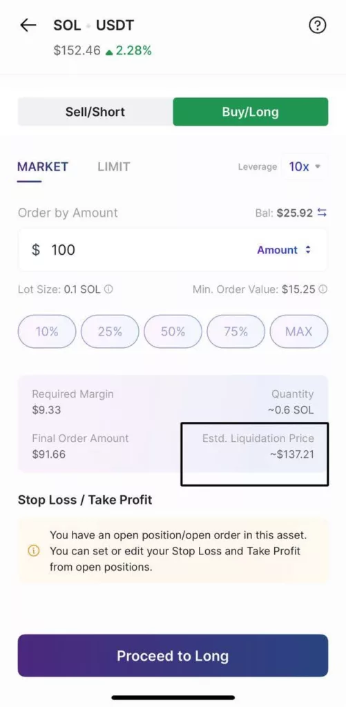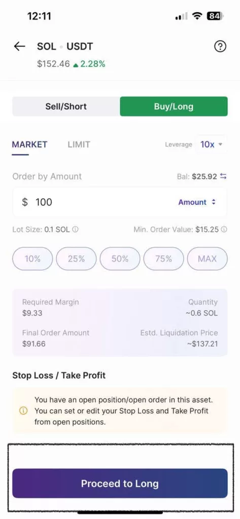 Once your risk levels are set, tap ‘Proceed to Long’ to place the trade.