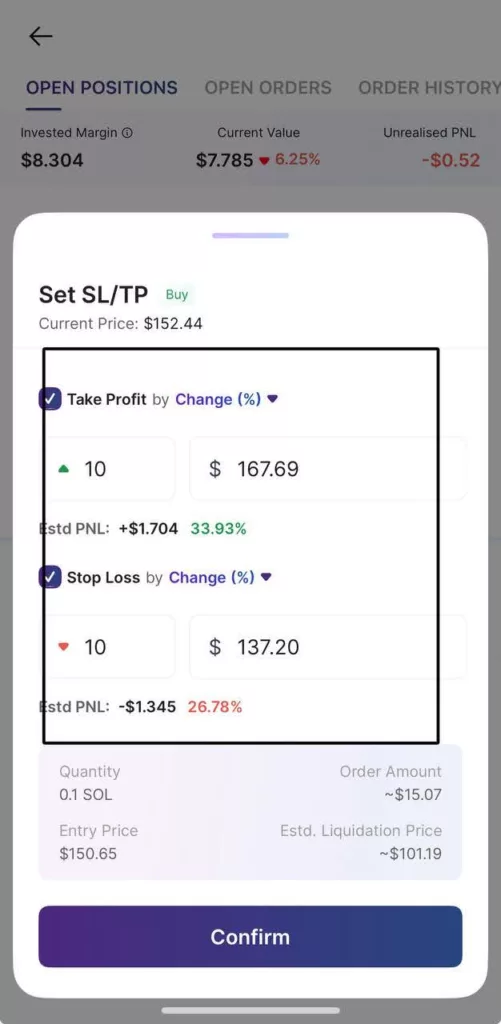 We’ll open a long position, expecting Solana’s price to rise. Set your leverage — here, we’re using 3x — and enter a trade size, say $50. The margin required in your wallet will be around $13.49, based on the leverage chosen.